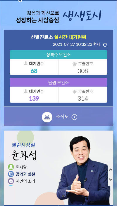 전날부터 시작된 실시간 대기현황 안내 서비스는 코로나19 진단검사를 위해 선별진료소를 방문하는 시민이 폭염 속에 긴 시간 대기하는 불편함이 없도록, 안산시청 홈페이지에서 상록수·단원보건소 선별진료소 대기현황을 실시간으로 제공한다.
