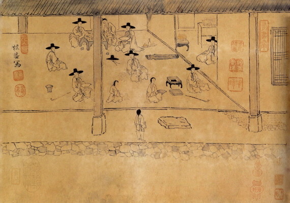 현정승집도는 1747년 복날을 맞아 표암 강세황 선생이 유경종, 박도맹 등 모두 11명의 선비들과 모여 청문당 대청마루에서 시를 짓고 거문고를 연주하는 등 당시 선비들이 풍류를 즐기는 모습을 그린 그림이다.