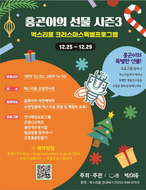[프레스뉴스] 장현준 기자= 시흥시(시장 임병택)는 12월 25일부터 29일까지 곤충전시체험관 ‘벅스리움’에서 크리스마스 특별프로그램 ‘흥곤이의 선물’ 시즌3을 운영한다. 이번 특별프로그램은 어린이 가족을 대상으로 상설 교육 프로그램과 특별프로그램을 동시에 즐길 수 있도록 마련됐다.