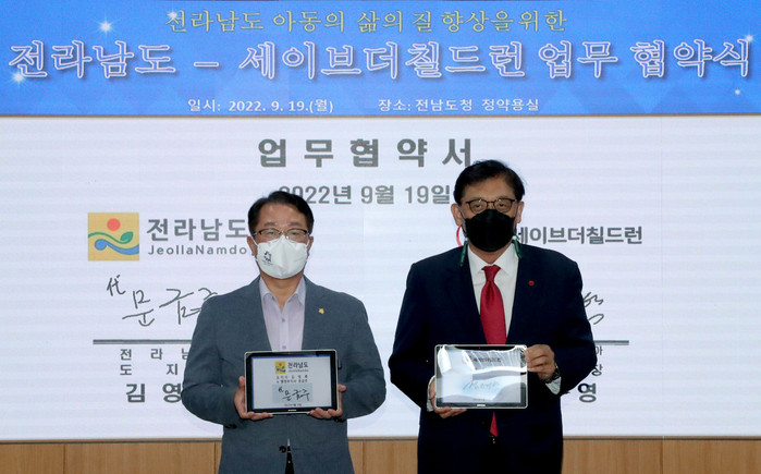 [전남=프레스뉴스] 강래성 기자= 전라남도는 19일 도청에서 세이브더칠드런과 아동 삶의 질 향상을 위한 환경 개선과 권리 향상 사업 등을 지원하는 업무협약을 했다.