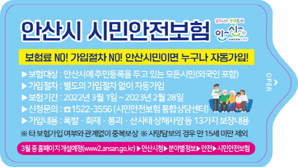 이에 따라 올해 처음 안산시 시민안전보험이 시행되며, 안산시에 주민등록을 두고 거주하는 모든 시민은 별도 가입절차 없이 다음달 1일부터 자동으로 보험가입자로 등록된다.