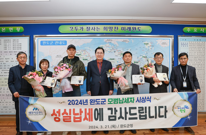 한편 전라남도 모범 납세자로 완도군에서는 완도군 산림조합(조합장 이경동)과 윤명숙(호텔K), 최번부(제일물산) 대표가 선정되었으며, 지난 3월 4일 전라남도청에서 모범 납세자 증서를 수여받았다.