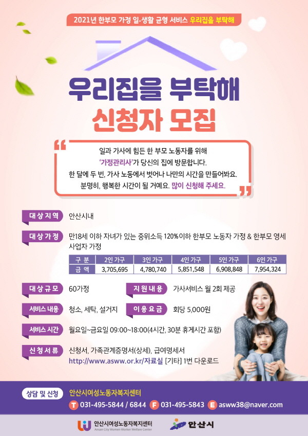 ▲ 2021년 한부모 가정 일·생활 균형 서비스 우리집을 부탁해 신청자 모집 포스터(사진=안산시) |