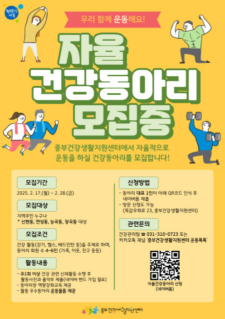 중부건강생활지원센터 관계자는 “이번 자율 건강동아리 모집을 통해 주민들이 자발적으로 운동에 참여하고, 건강한 생활 습관을 지속할 수 있도록 지원할 예정”이라며, “많은 주민의 관심과 참여를 바란다”라고 말했다.