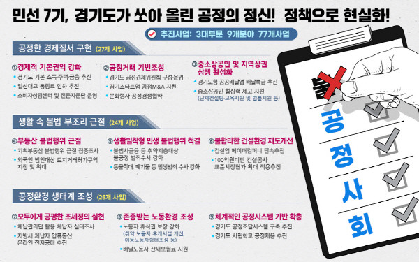 민선 7기 3주년을 앞두고 공정성 확립을 위한 경기도의 노력을 ▲공정한 경제질서 구현 ▲생활 속 불법·부조리 근절 ▲공정생태계 조성 등 3대 부문 77개 정책으로 살펴봤다.