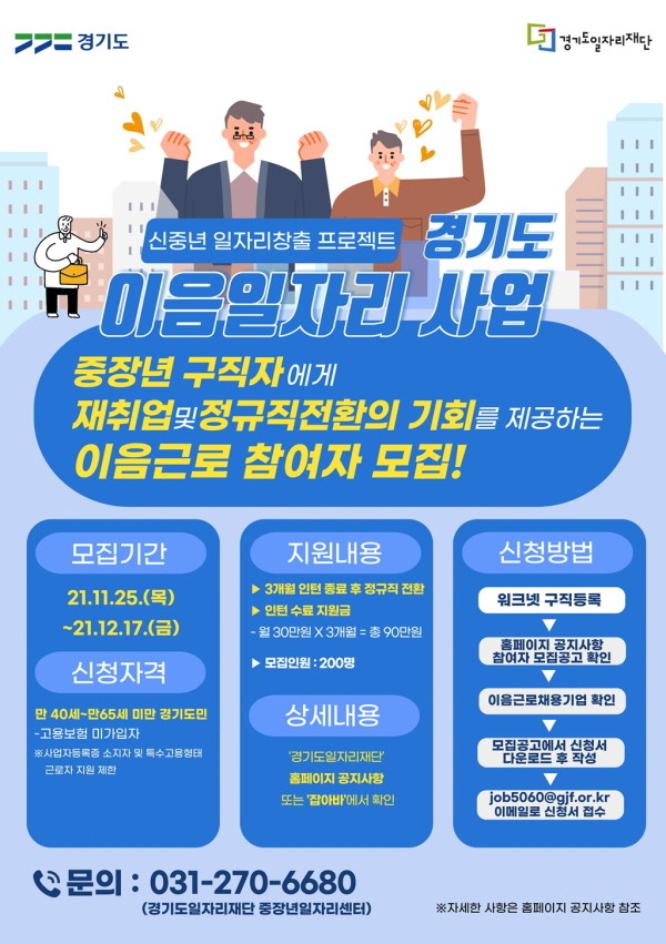 사업 및 참여자 모집에 대한 자세한 사항은 경기도일자리재단 중장년일자리센터로 문의하면 된다.