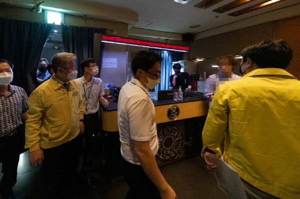 이재명 경기도지사는 22일 밤 10시경 안양시에 위치한 한 유흥주점을 불시 점검하고 현장에서 함께 술을 마시던 여성접객원과 손님 등 7명을 적발했다.