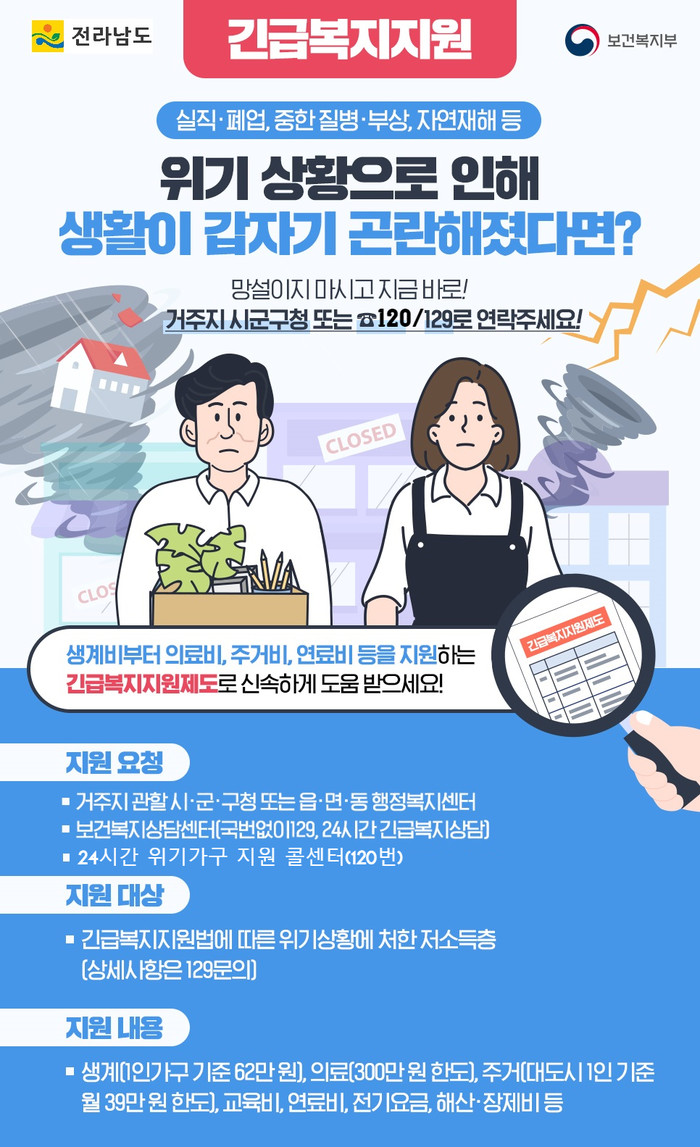 긴급 지원을 바라는 도민은 주민등록 주소지 시군이나 읍면동 행정복지센터, 보건복지상담센터 129번, 전남도가 운영하는 24시간 위기가구지원 콜센터 120번을 통해 상담받을 수 있다.