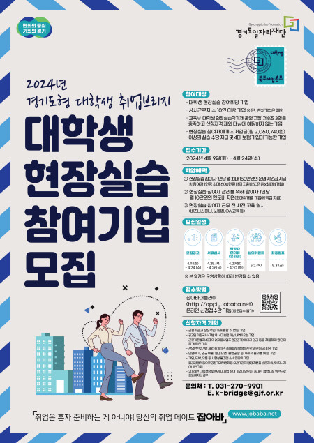 ▲2024년 경기도형 대학생 취업브리지 대학생 현장실습 참여기업 모집 포스터 (사진=경기도일자리재단) |