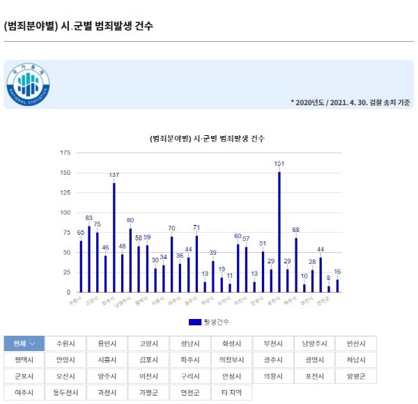 게시된 통계는 ▲시군별 범죄 발생 ▲월별 범죄 발생 ▲범죄 분야별 범죄자 연령대 ▲범죄자 범행동기 ▲범죄자 직업군 ▲범죄 발생 장소 ▲범죄자 처분 결과 ▲범죄자 전과 및 재범 현황 ▲연도별 범죄 발생 ▲연도별 범죄자 연령대 등 총 10종으로 구성됐다.