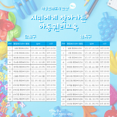 이에 시는 25개 동 행정복지센터에 전문 강사가 직접 찾아가 시민 500여 명을 대상으로 아동의 4대 기본권리(생존권, 보호권, 참여권, 발달권)와 아동학대 예방을 위한 올바른 양육 방법에 대한 교육을 진행할 예정이다.