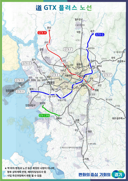 지난 1일 경기도는 기존 GTX 노선의 혜택을 받지 못하는 지역에도 GTX 노선을 신설해 수혜지역을 넓히기로 계획했다. 이를 위해 GTX 플러스 노선안을 확정, 공개하고 이를 오는 5월 제5차 국가철도망 구축계획에 반영될 수 있도록 정부에 건의하기로 발표했다.