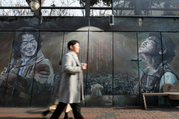 | ▲한파가 물러가고 포근한 날씨를 보인 4일 오후 '영원한 가객' 고 김광석(1964~1996) 30주기를 이틀 앞두고 주말을 맞아 대구 중구 방천시장 김광석길을 찾은 시민들이 김광석의 노래를 들으며 그를 추억하고 있다./사진=뉴스1 |