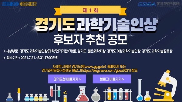 후보자 추천 접수는 21일부터 다음 달 31일까지 진행되며, 1.2차 심사를 거쳐 최종 선정된 과학기술인상 수상자들은 10월 말에 예정된 경기과학축전의 시상식에서 수상하게 된다.