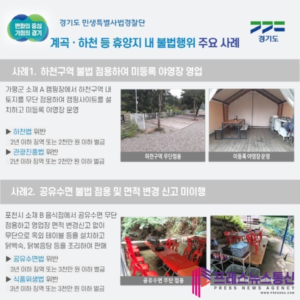 [프레스뉴스] 장현준 기자= 계곡이나 하천에서 토지를 무단 점용해 캠핑장을 운영하거나 닭백숙을 판매하는 등 불법행위를 저지른 업주들이 경기도 특별사법경찰단에 무더기 적발됐다.