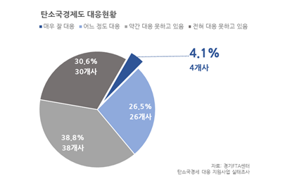 탄소국경조정제도 대응에 대해서는 4곳(4.1%)만이 ‘매우 잘 대응하고 있다’고 답했다. ‘어느 정도 대응하고 있다’는 26.5%(26곳), ‘약간 대응하지 못하고 있다’는 38.8%(38곳), ‘전혀 대응하지 못하고 있다’는 30.6%(30곳)로, 응답 기업의 69.4%가 탄소국경조정제도에 제대로 대응하지 못하고 있었다.