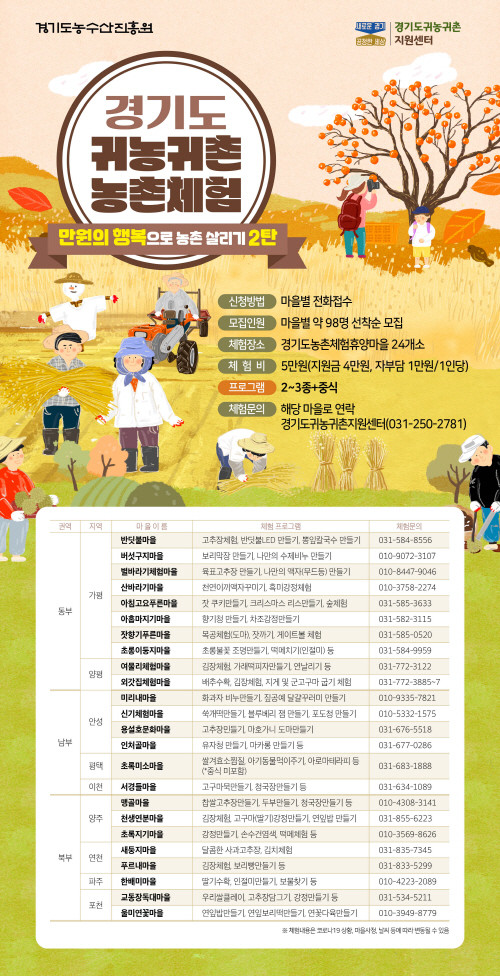 신청은 경기도귀농귀촌지원센터 누리집 내 공지사항 모집 포스터의 마을별 연락처로 전화해 신청하면 된다.