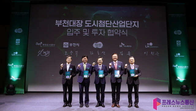 | ▲ 지난 4월 4일 오후 부천아트센터에서 열린 도시첨단산업단지 입주 및 투자 협약식에서 김동연 경기도지사와 부천시장, LH사장, SK이노베이션 대표 등 주요참석자들이 참석한 가운데 기념촬영을 하고 있다.(사진=경기도) |
