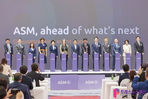 | ▲ 지난 5월 24일 오전 에이에스엠케이에서 열린 네덜란드 ASM 기공식 행사에서 김동연 경기도지사, 벤자민 로 ASM CEO, 폴린 반데메르 모어 ASM 의사회 의장, 김용길 에이에스엠 코리아 회장, 김완기 산업통상자원부 무역투자실장, 요아나 도너바르트 주한네덜란드 대사, 정명근 화성시장 등이 기공식 버튼 세레모니를 하고 있다.(사진=경기도) |