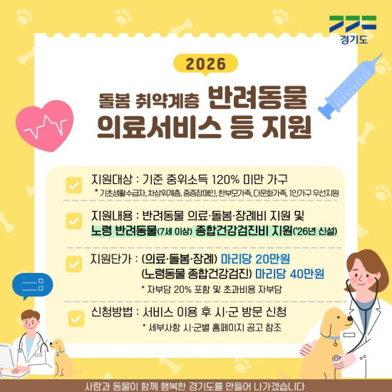 변희정 경기도 반려동물과장은 “취약계층의 외로움을 덜어줄 수 있는 반려동물이 더 오래 건강하게 곁을 지킬 수 있도록 지원 규모도 확대하고 노령 동물 종합건강검진 지원도 신설했다”며 “경기도는 사람과 동물이 서로의 온기를 나누며 끝까지 함께 걸어갈 수 있는 따뜻한 반려 문화를 만들어 가겠다”고 말했다.
