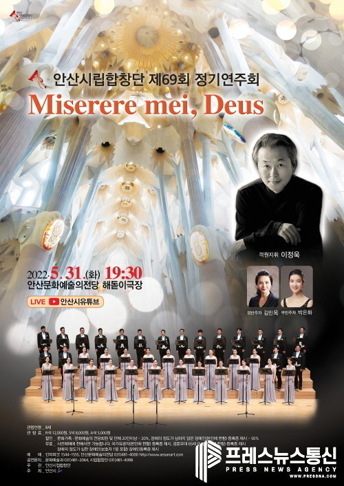 [프레스뉴스] 장현준 기자= 안산시는 안산시립합창단 제69회 정기연주회 ‘Miserere mei, Deus’ 공연이 이달 31일 오후 7시30분 안산문화예술의전당 해돋이극장에서 열린다고 26일 밝혔다.