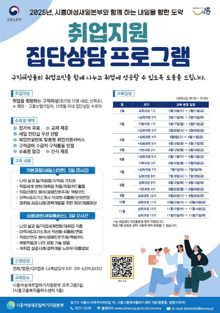 취업을 희망하는 여성이라면 누구나 참여할 수 있으며, 교육 신청 방법 및 자세한 사항은 시흥시청 누리집의 일자리경제포털 및 시흥여성새일본부로 문의하면 된다.