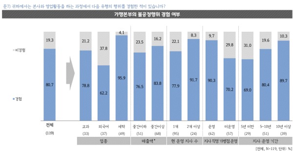 경기도 조사 결과, 가맹지사의 80.7%가 가맹본부의 부당행위나 불공정행위를 경험했다고 응답했다. 업종별로 세탁이 95.9%에 달했으며 교과는 78.8%, 외국어는 62.2%다.
