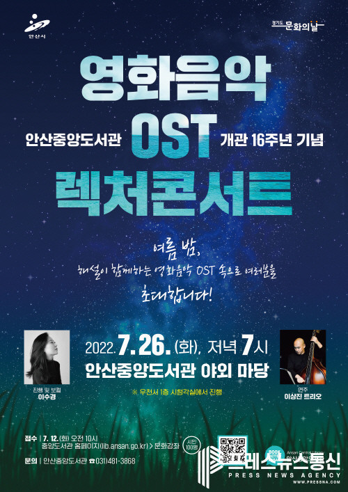 [프레스뉴스] 장현준 기자= 안산시(시장 이민근) 중앙도서관은 개관 16주년을 맞아 ‘영화음악 OST 렉처콘서트’를 선보인다고 12일 밝혔다.