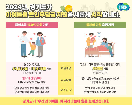 안승만 경기도 가족다문화과장은 “아이돌봄서비스 본인부담금 지원을 통해 매년 증가하는 서비스 이용요금에 대한 부담을 경감하고, 둘째아 이상 출생가정 지원을 통해 저출생 해소에 조금이라도 보탬이 됐으면 좋겠다”고 말했다.