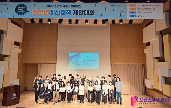 | ▲ 지난 27일 단원청소년수련관 소극장 끼나래에서 열린 2022년 안산시 청소년 예산정책 제안대회에 참가한 청소년들이 기념촬영을 하고 있다.(사진=안산시) |