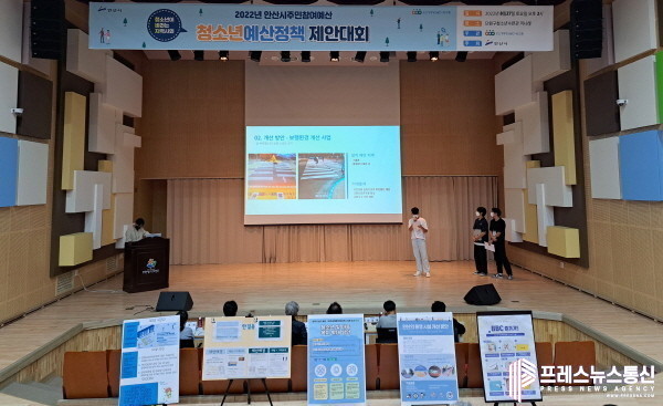 | ▲ 지난 27일 단원청소년수련관 소극장 끼나래에서 열린 2022년 안산시 청소년 예산정책 제안대회에 참가한 청소년이 정책를 발표하고 있다.(사진=안산시) |