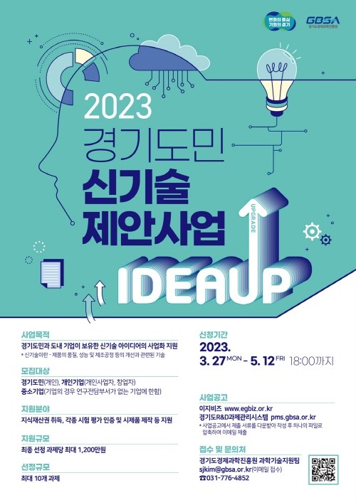 [프레스뉴스] 장현준 기자= 경기도와 경기도경제과학진흥원(이하 경과원)은 경기도민과 도내 기업의 우수 신기술을 발굴하고 기술 상용화와 사업화 지원을 위한 ‘2023년 경기도 신기술 제안사업’을 추진한다.