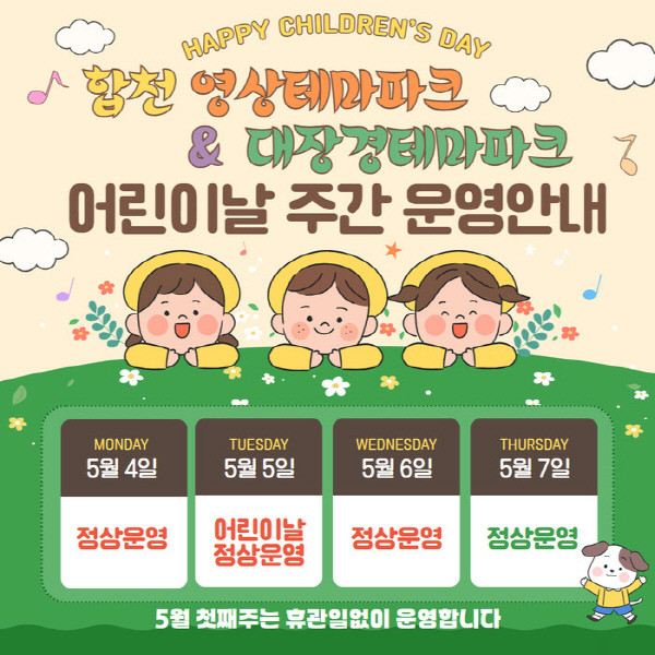 [프레스뉴스] 정재학 기자=합천군은 5월 가정의 달과 어린이날 연휴를 맞아 합천영상테마파크와 대장경테마파크를 휴관일 없이 정상 운영한다고 밝혔다. 해당 시설은 5월 4일부터 6일까지 오전 9시부터 오후 6시까지 방문객을 맞이한다.