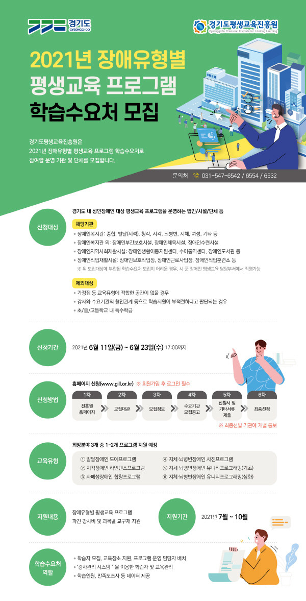 학습수요처 모집 대상은 도내 성인 장애인 대상 평생교육 프로그램을 운영하는 법인, 시설, 단체다. 도내 시.군의 장애인 평생교육 담당 부서에서 교육 프로그램을 운영하면 직접 신청할 수 있다.