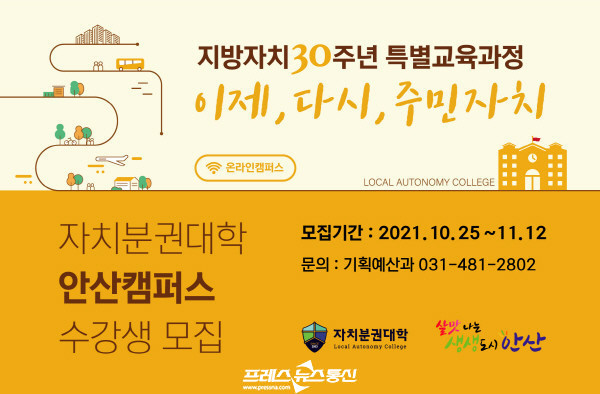 [프레스뉴스] 강보선 기자= 안산시(시장 윤화섭)는 지방자치 부활 30주년과 함께 새로운 자치분권 시대에 걸맞은 주민자치 역량을 강화하기 위해 ‘2021년 가을학기 자치분권대학 안산 캠퍼스’를 개설하고 11월 12일까지 수강생을 모집한다고 25일 밝혔다.