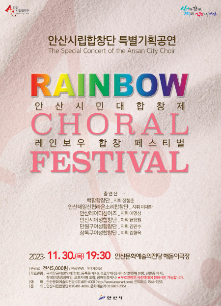 이영분 문화예술과장은 “일곱 빛깔을 가진 무지개가 주는 아름다움의 묘미처럼, 안산시립합창단과 관내 곳곳에서 활동 중인 6팀의 합창단이 선사하는 감동적인 선율을 즐기시길 바란다”고 말했다.