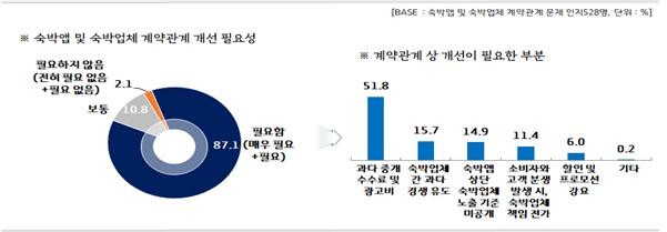 이에 숙박업체는 숙박앱과 거래 시 개선이 필요한 부분을 묻는 질문(중복응답)에 수수료‧광고비 책정 기준 공개(61.8%)와 광고 노출순위 결정 기준 공개(44.4%)를 가장 많이 지목했다.