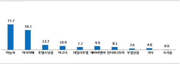 소비자들은 호텔, 모텔, 펜션 등 숙박 유형과 상관없이 야놀자(71.7%), 여기어때(56.1%) 등을 가장 많이 이용하는 것으로 드러났다. 숙박앱 사용 시 불편한 점에 대해서는 소비자들은 사진과 다른 객실 같은 과대광고(49.8%)와 변경‧취소 및 환불 관련 규정(18.0%) 등을 꼽았다.