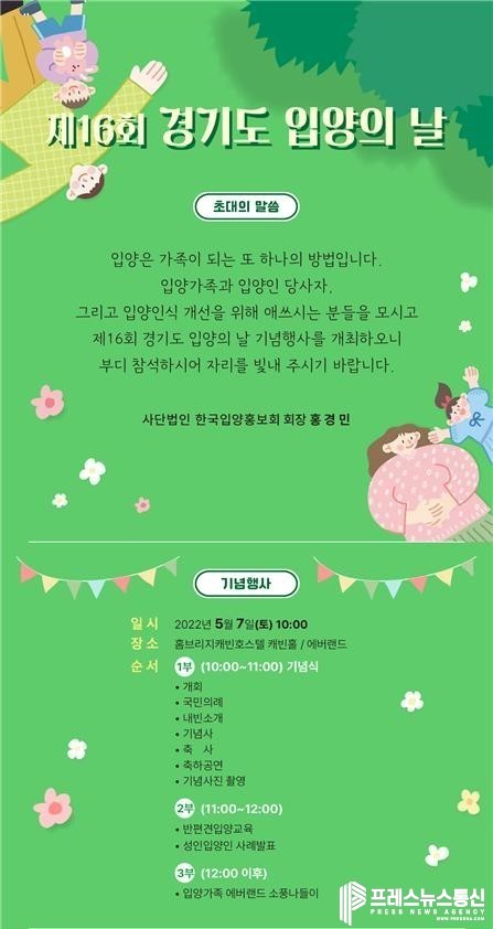 [프레스뉴스] 장현준 기자= 경기도가 5월 11일 입양의 날을 앞두고 7일 오전 10시 용인 에버랜드에서 제16회 입양의 날 기념행사를 개최한다.