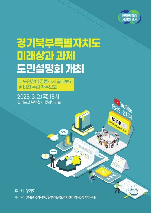 [프레스뉴스] 장현준 기자= 경기도가 3월 2일 오후 3시부터 경기도청 북부청사 평화누리홀에서 ‘경기북부특별자치도의 미래상과 과제 도출’을 의제로 진행한 공론조사 결과를 도민과 공유하고, 경기북부특별자치도 설치 관련 연구용역 착수 도민설명회를 개최한다.