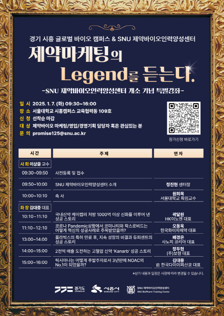 이번 강좌는 정식 개소를 앞둔 (가칭) 경기시흥 글로벌 바이오 캠퍼스-SNU 제약바이오인력양성센터의 특별강좌로, ‘제약 마케팅의 전설(Legend)을 듣는다’를 주제로 제약바이오 마케팅, 영업, 경영기획 담당자 등 200여 명을 대상으로 진행되며 신청자 마감이 완료됐다.