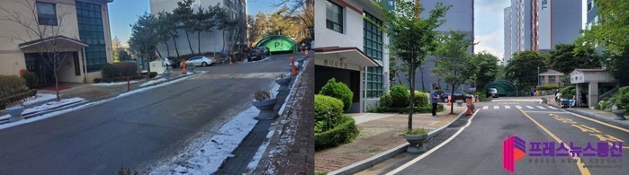 | ▲사진 왼쪽, (자문전)관리사무소 앞 보행자 안전시설물 없음, 오른쪽(자문후)관리사무소 앞 보행자 횡단보도 설치(사진=경기도) |