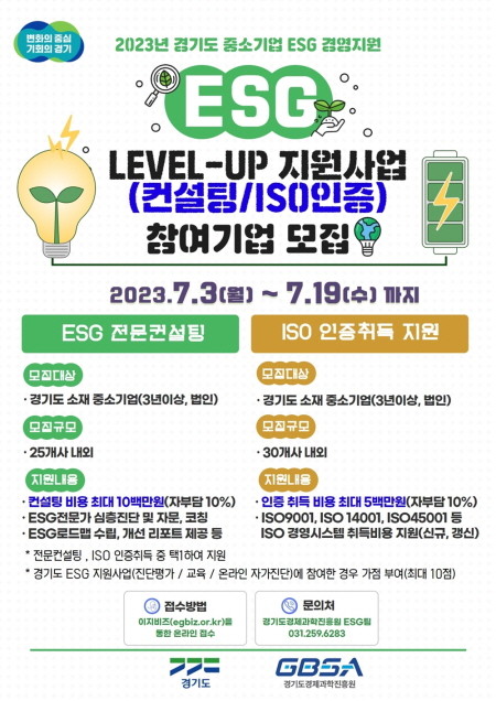 경기도는 오는 19일까지 이지비즈를 통해 환경·사회·투명(ESG) 경영 전문 컨설팅은 25개 사, 환경·사회·투명(ESG) 경영 관련 국제 인증 취득 지원은 30개 사를 모집한다.