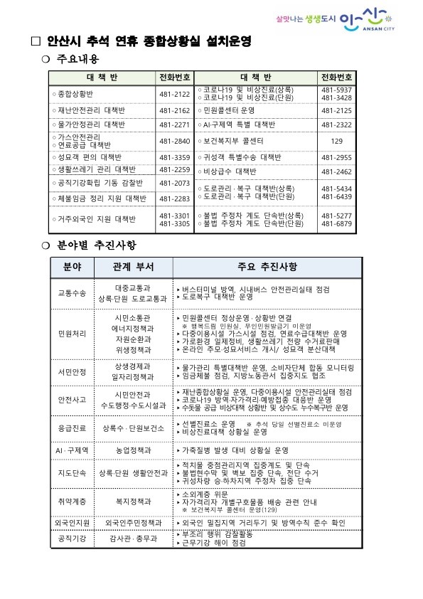 종합상황실은 코로나19 확산 방지를 위해 코로나19 민원 현장대응반을 운영해 24시간 감염병 상시 대응 체계를 구축하고 ▲시민 생활과 직결되는 생활쓰레기 ▲비상 수돗물 서비스 ▲비상진료 대책반 ▲민원콜센터 ▲도로교통 ▲재난안전 ▲AI비상대책 ▲성묘객 편의 및 온라인 추모·성묘서비스 ▲외국인주민 방역물품 지원 등 모두 20여개 부서가 참여하며 연휴기간 시민 불편을 최소화 한다는 방침이다.