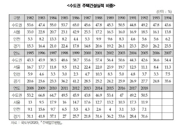 연구원은 이처럼 중앙 주도의 주택정책 구조에서 정부가 주택문제 발생 시 분권화 전략보다 수도권 대규모 택지개발을 택하며, 수도권 비대화를 초래했다고 지적했다. 1982~2018년 전국 대비 수도권 주택건설실적 비중은 2009년 최고 66.8%를 기록하는 등 대부분 50% 안팎을 유지했다. 특히 1기 신도시 입주 시기(1990~1995년)에는 수도권 인구 증가율이 전국 인구 증가율의 3.12배에 달하기도 했다.