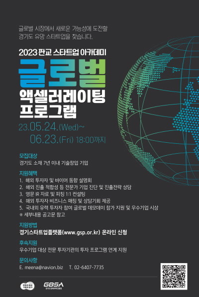 | ▲ 2023 판교 스타트업 아카데미 ‘글로벌 액셀러레이팅 프로그램’ 참여 기업 모집 포스터(사진=경기도경제과학진흥원) |
