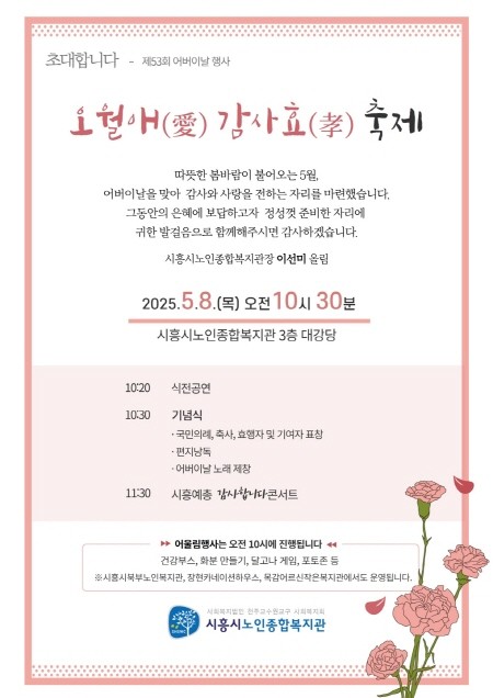[프레스뉴스] 장현준 기자= 시흥시노인종합복지관(관장 이선미)이 주관하는 제53회 어버이날 기념 ‘오월애(愛), 감사효(孝) 축제’가 5월 8일, 시흥시노인종합복지관에서 개최한다.