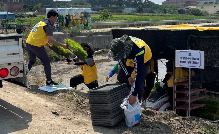 | ▲4-H연합회 회원들이 13일 학교면 공동과제포에서 모내기 작업을 하고 있다(사진제공=함평군) |