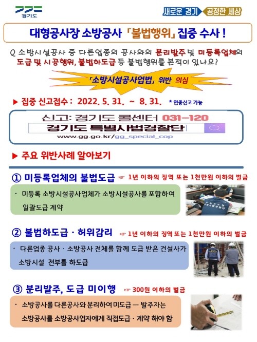 | ▲ 대형공사장 소방공사 「불법행위」 집중 수사(이미지카드)사진=경기도 |