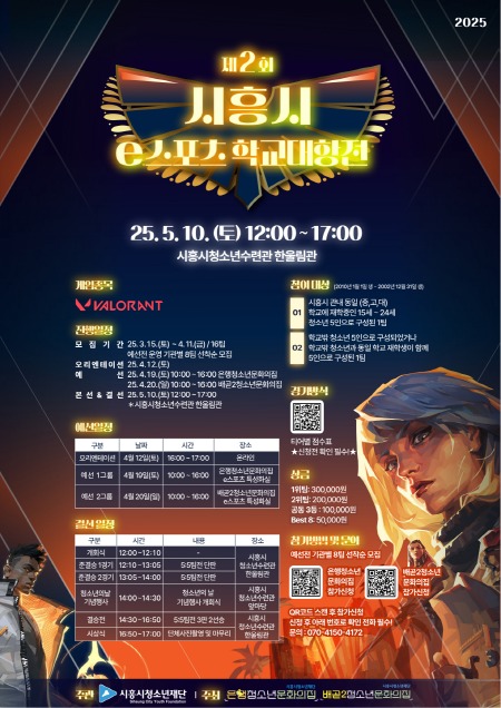 [프레스뉴스] 장현준 기자= (재)시흥시청소년재단(대표이사 이덕희)은 시흥시 관내 청소년들을 위한 ‘2025 제2회 시흥시 e스포츠 학교대항전’을 오는 5월 10일 개최하며, 참가팀 모집을 진행한다. 이번 대회는 청소년들의 건전한 e스포츠 여가 문화 조성 및 활성화를 목적으로 은행청소년문화의집과 배곧2청소년문화의집에서 예선전을 나눠 운영하며, 시흥시청소년수련관 한울림관에서 결승전이 열린다.